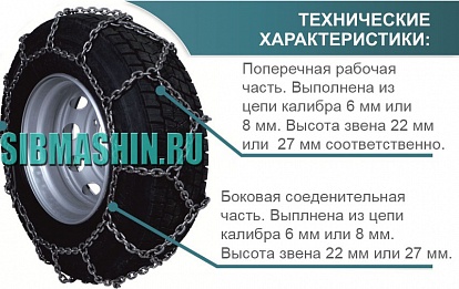 Цепи противоскольжения для грузовых автомобилей на сдвоенные (спаренные) колеса изготавливаются из цепей 6/6 мм, 8/6 мм и 8/8 мм (где первая цифра — калибр поперечной рабочей части цепи, вторая цифра — калибр боковой соединительной части цепи).